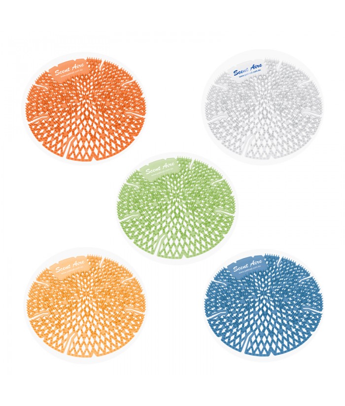 Scentaire Urinal Screen10/Box- Twelve times more fragrant that other screens, the fragrance releases over 30 days. Two-sided anti-splash texture, preventing splash back and cross contamination of urine to other areas outside the restroom. Extremely flexible to allow proper fit to any urinal contour. Translucent design allows total viewing of the drain to ensure it remains free flowing. Safe for use in waterless urinals...