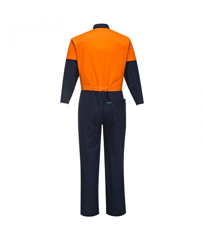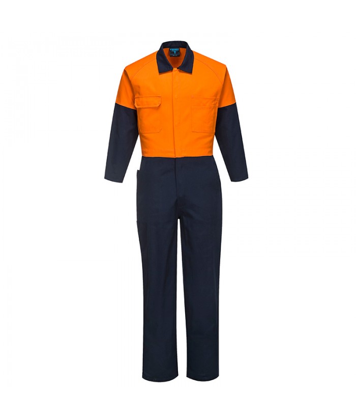 Coverall GSM Navy/Orange100% Pre Shrunk 2 tone Cotton Coveralls. Functional pocket design with deep hip pockets, 2 large back pockets and right chest pocket with flap and metal button closure and left chest with pen division layered pockets. Reinforced stress points for wearer durability and comfort. Durable Metal stud closure. Features: 50+ UPF rated fabric to block 98% of UV raysStud front opening for easy accessConcealed stud front for easy accessContrast panels for protection against dirtDeep storage po..