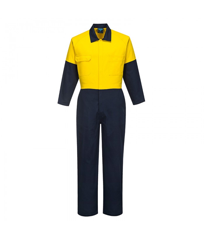 Coverall GSM Navy/Yellow100% Pre Shrunk 2 tone Cotton Coveralls. Functional pocket design with deep hip pockets, 2 large back pockets and right chest pocket with flap and metal button closure and left chest with pen division layered pockets. Reinforced stress points for wearer durability and comfort. Durable Metal stud closure.Features:* 50+ UPF rated fabric to block 98% of UV rays* Stud front opening for easy access * Concealed stud front for easy access * Contrast panels for protection against dirt * Deep storage pockets * Reinforced seams for extra durability and strengt..